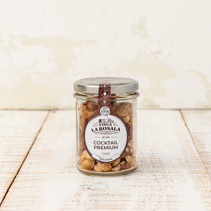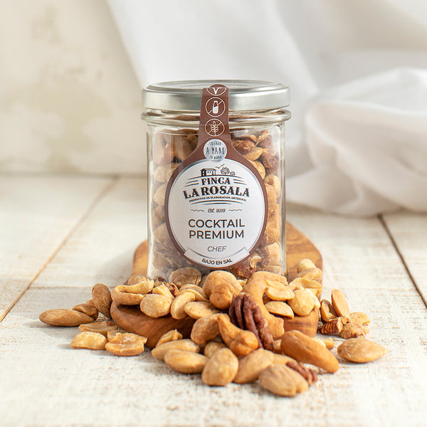 Cocktail compuesto de cacahuetes sin piel (50%), almendras Valencia sin piel (25%), anacardos (15%), pecana (10%), aceite de oliva virgen extra, sal y pimentón de la Vera.