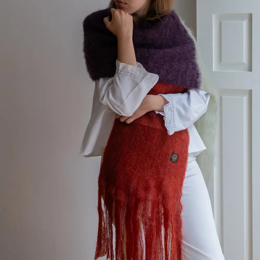 Este chal bufanda de mohair en color berenjena, crudo y rojo, con flecos largos y finos, está fabricado por Ezcaray, una empresa familiar con más de 80 años de experiencia.