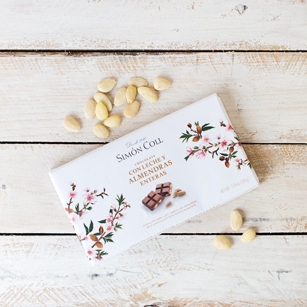 Milk chocolate with whole almonds. Enjoy this chocolate tasting the almonds at their optimal roasting point. Made with selected almonds from the country and creamy and fine milk chocolate but with character.