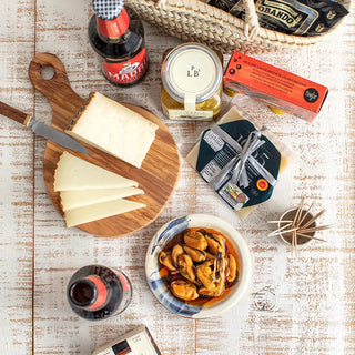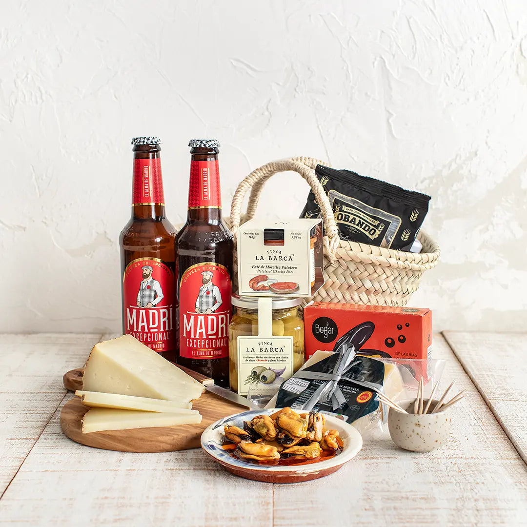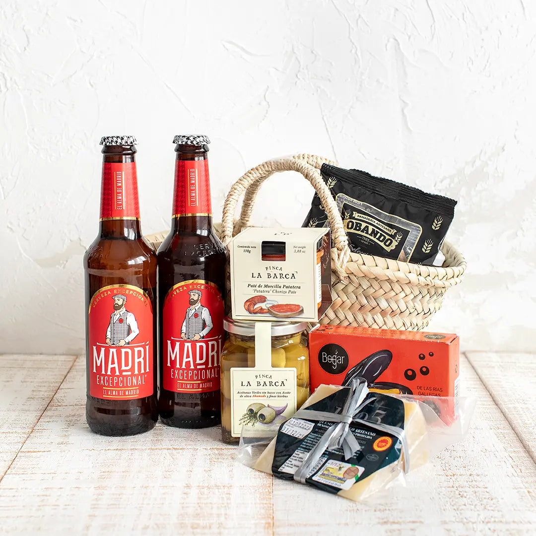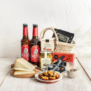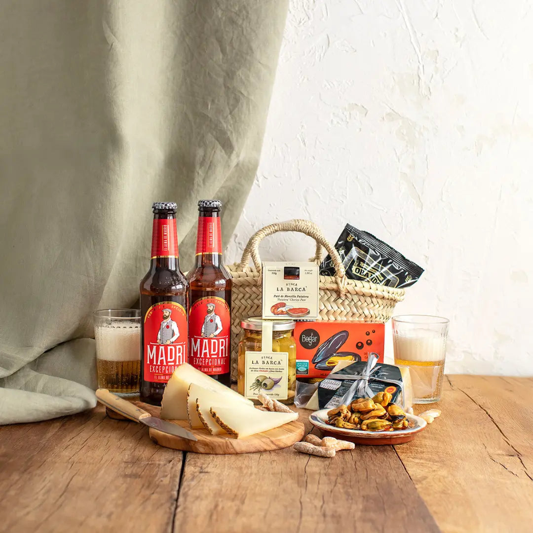 We're looking forward to the weekend so we can prepare a delicious aperitif. And we have the perfect pack for beer lovers: two bottles of our Madri pilsner, cheese, olives, and mussels. And all packed in a basket: it's the ideal gift to send or take to a friend's house to give them the best of surprises.