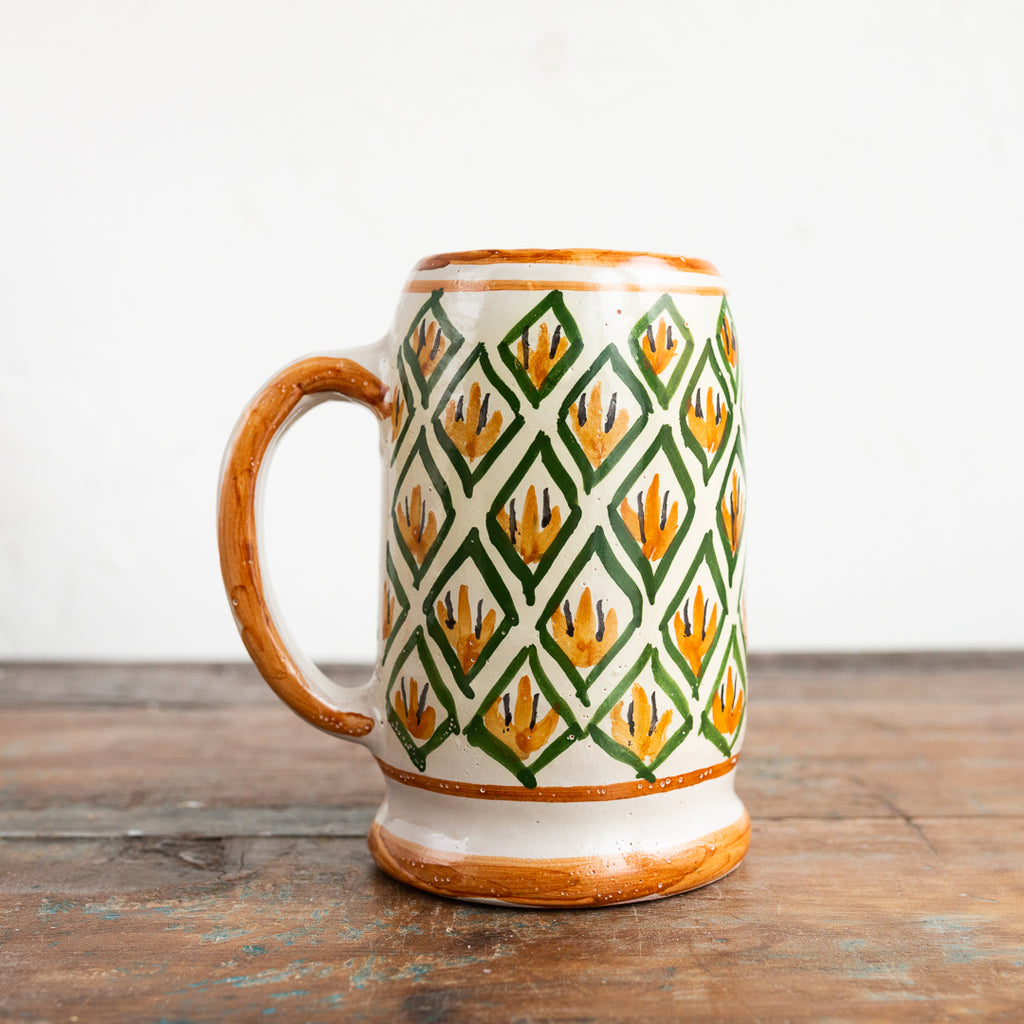 These hand-painted ceramic beer mugs are ideal for an aperitif or for breakfast. They are characterized by the floral motifs so typical of Cáceres ceramics as well as the bright colors of their edges and decorated interiors.
