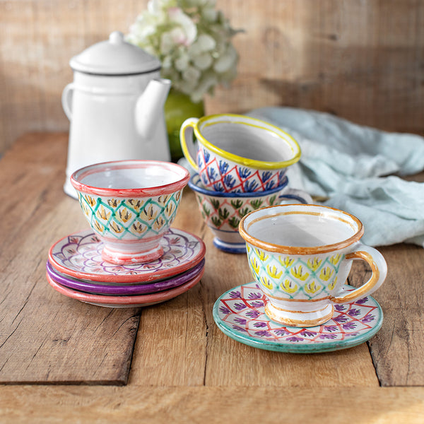This hand-painted coffee set, which contains 4 cups and 4 saucers of assorted colors, is ideal for you to have a leisurely breakfast or snack. They are characterized by the floral motifs so typical of Cáceres ceramics as well as the bright colors of their edges and decorated interiors.