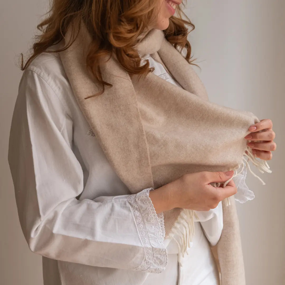 Estas bufandas de lana merino tienen una tradición que se remonta a más de 100 años. Se elaboran en la fábrica de Grazalema, en la Sierra de Cádiz, un entorno conocido por su rica herencia textil y sus ovejas merinas, que producen una lana de alta calidad, muy suave y naturalmente transpirable. Las ovejas merinas tienen una lana más fina, ideal para prendas que están en contacto directo con la piel. Sus flecos están anudados a mano uno a uno.