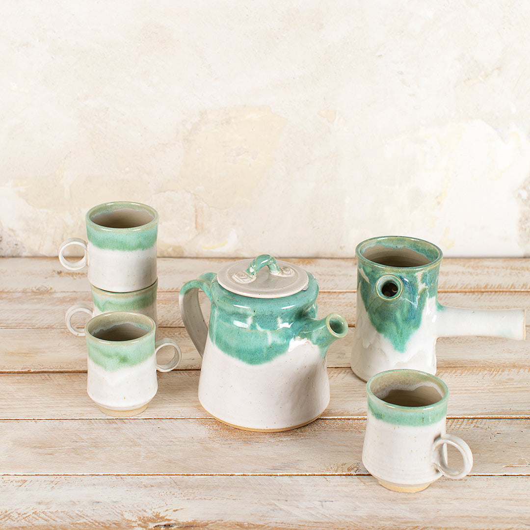 Este juego de café de cerámica artesana viene de Galicia, recién salido del torno de Nano, nuestro artesano rockero. Un erudito en cuanto a materiales y tradición ceramista gallega se refiere. Bueno, y al Rock & Roll que escucha mientras elabora estas piezas tan especiales. ¿Oyes la música?