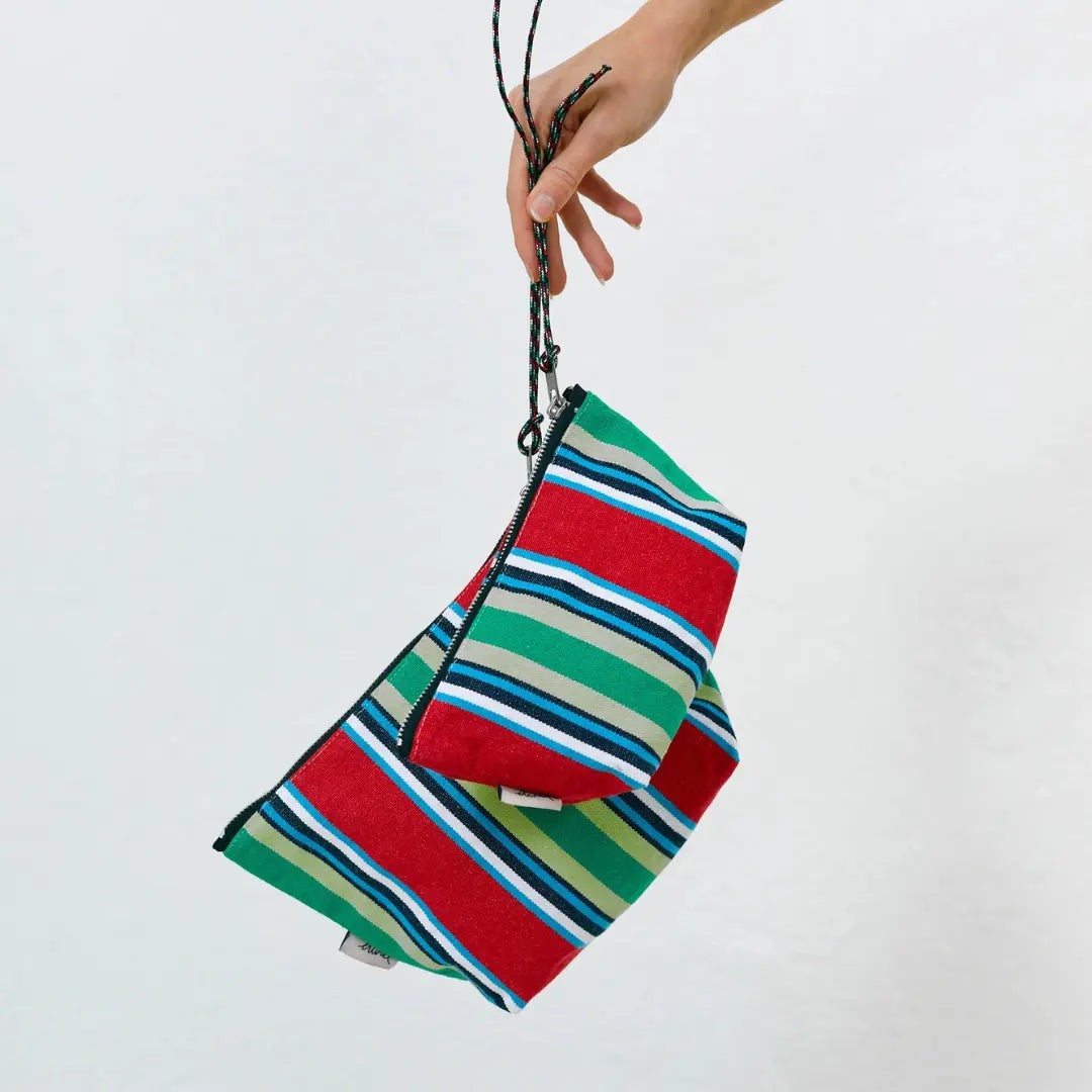 Este estuche es de los que siempre llevas contigo para no volver a perder nada dentro del bolso nunca más. Te acompaña al mercado, a la playa, a la piscina y a por algo de fruta. Está elaborado de forma artesanal con lonetas típicas de las hamacas de playa que te transportará directamente la imagen de la costa a rebosar de sombrillas y hamacas de las de toda la vida.