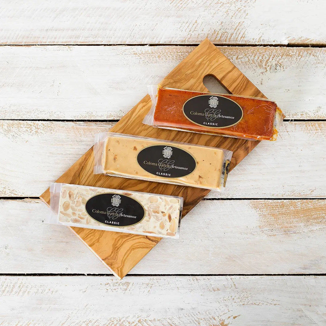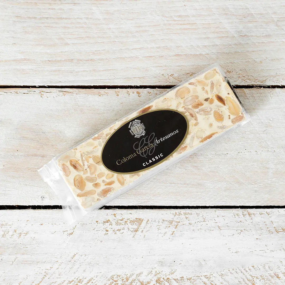 Turrón de Alicante de elaboración totalmente artesanal a partir de almendra marcona seleccionada y tostada, miel de azahar, azucar y oblea. El Turrón de Alicante Coloma García es un turrón de máxima calidad, tiene una textura crujiente y agradable sabor y aroma a almendra de primera categoría.
